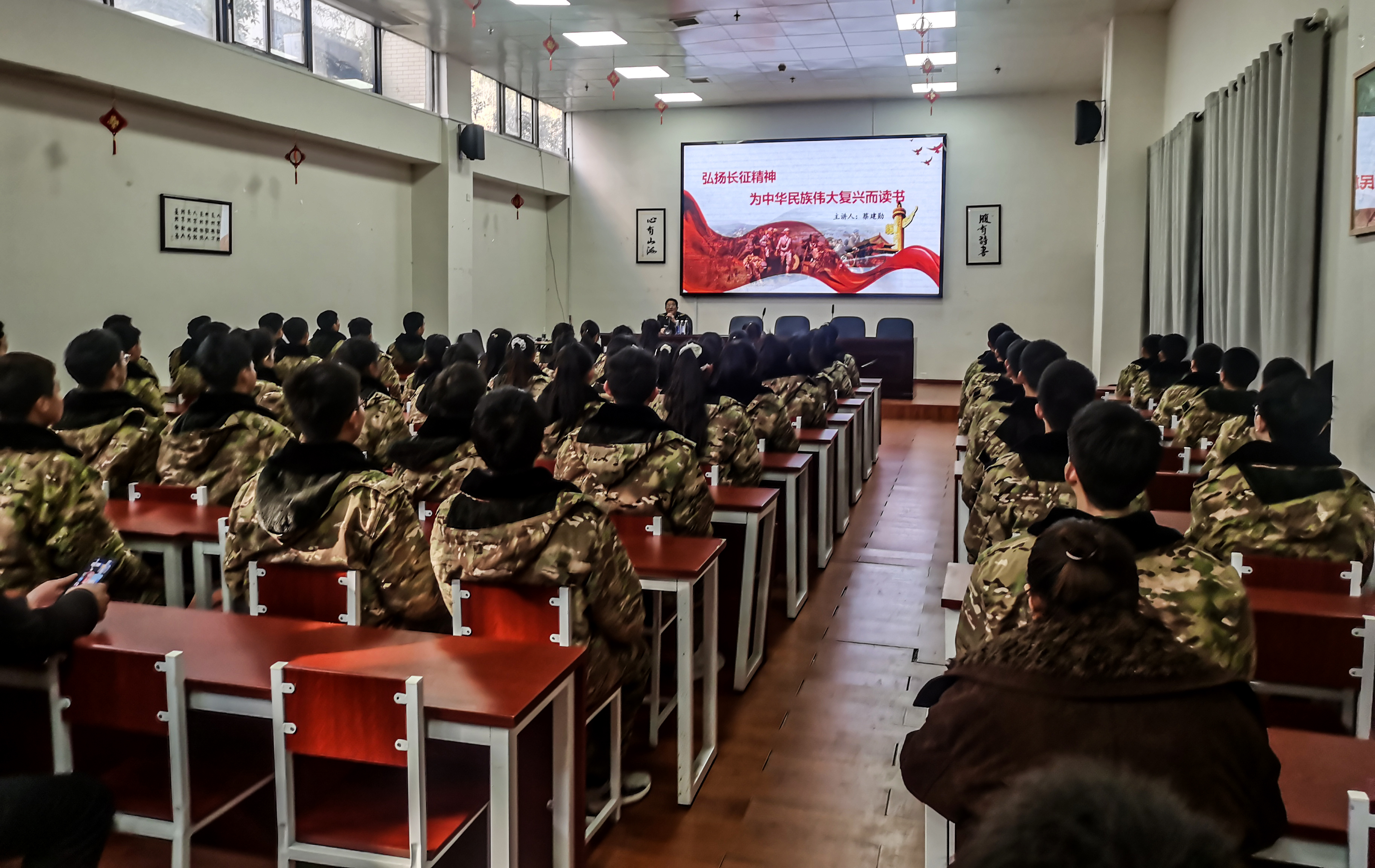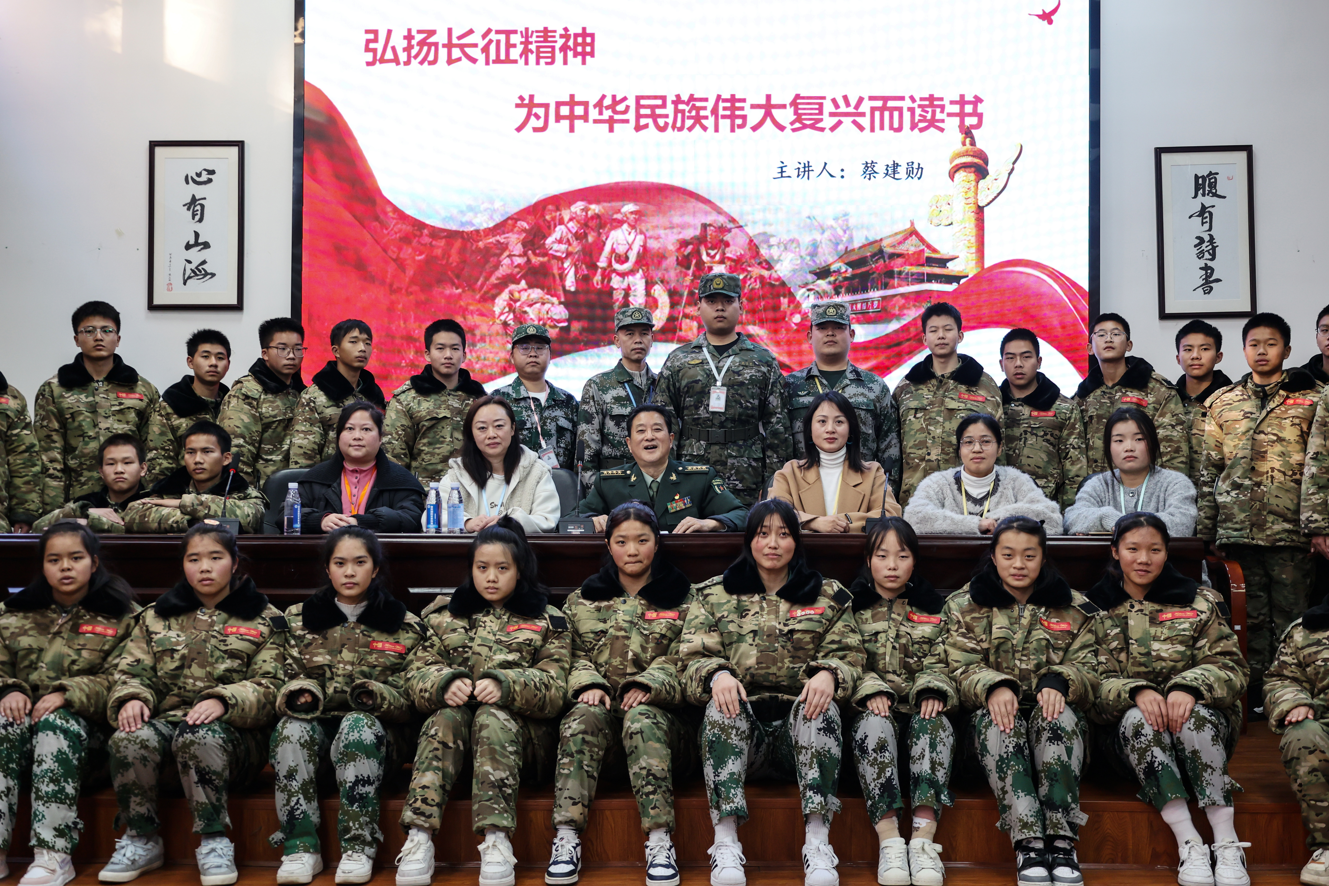 2026年1月中旬,湖南长沙楚现军举集团国防素质教育基地内展板林立、氛围肃穆热烈。值此中国工农红军长征胜利90周年之际,为响应《人民日报》元旦献辞中“传承长征精神、推进民族复兴”的时代号召,基地特邀长征历史研究专家、国防科技大学原某院大校蔡建勋,为全体初、高中学生带来《弘扬长征精神,为中华民族伟大复兴而读书》专题宣讲,并同步举办《汲取奋进力量,续写时代华章》红色主题摄影展。两场活动相互呼应、深度融合,为青少年们送上了一堂浸润心灵的红色教育盛宴。