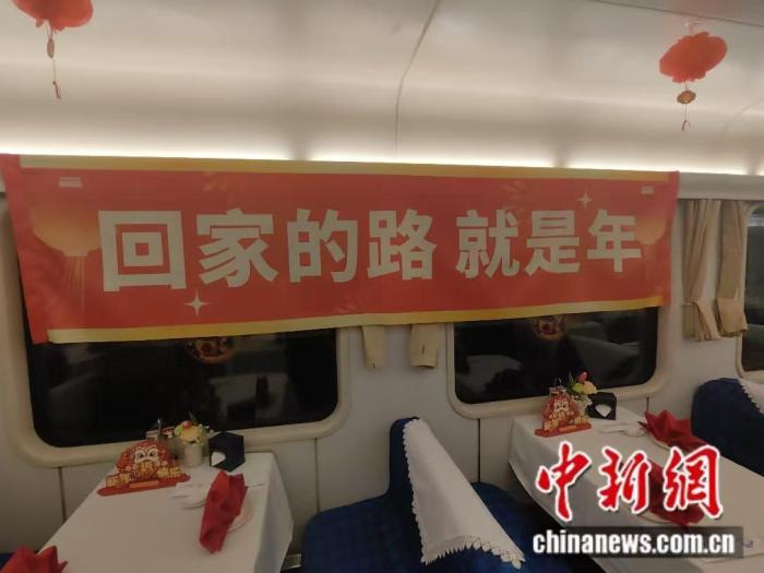 记者在现场看到,作为北京的“春运首发列车”,K4069次列车的车厢内挂有灯笼,张贴着春联,并悬挂着“回家的路就是年”横幅。