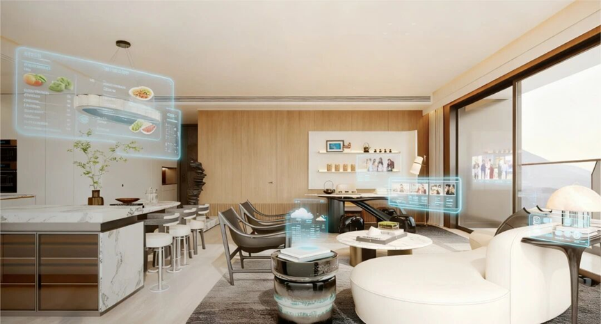室内约3.5米的层高,不仅带来了开阔通透的空间感,也为个性化的艺术陈设与智能系统集成提供了更多可能。270°转角环幕客厅结合全玻璃幕墙,创造了震撼的视野与采光。尤其值得一提的是创新的LDKT(客厅、餐厅、厨房、茶厅)一体化设计,打破了以电视墙为中心的传统布局,融入独立休闲茶台,使客厅成为融合社交、亲子、阅读、轻餐饮的复合型家庭核心交流场。