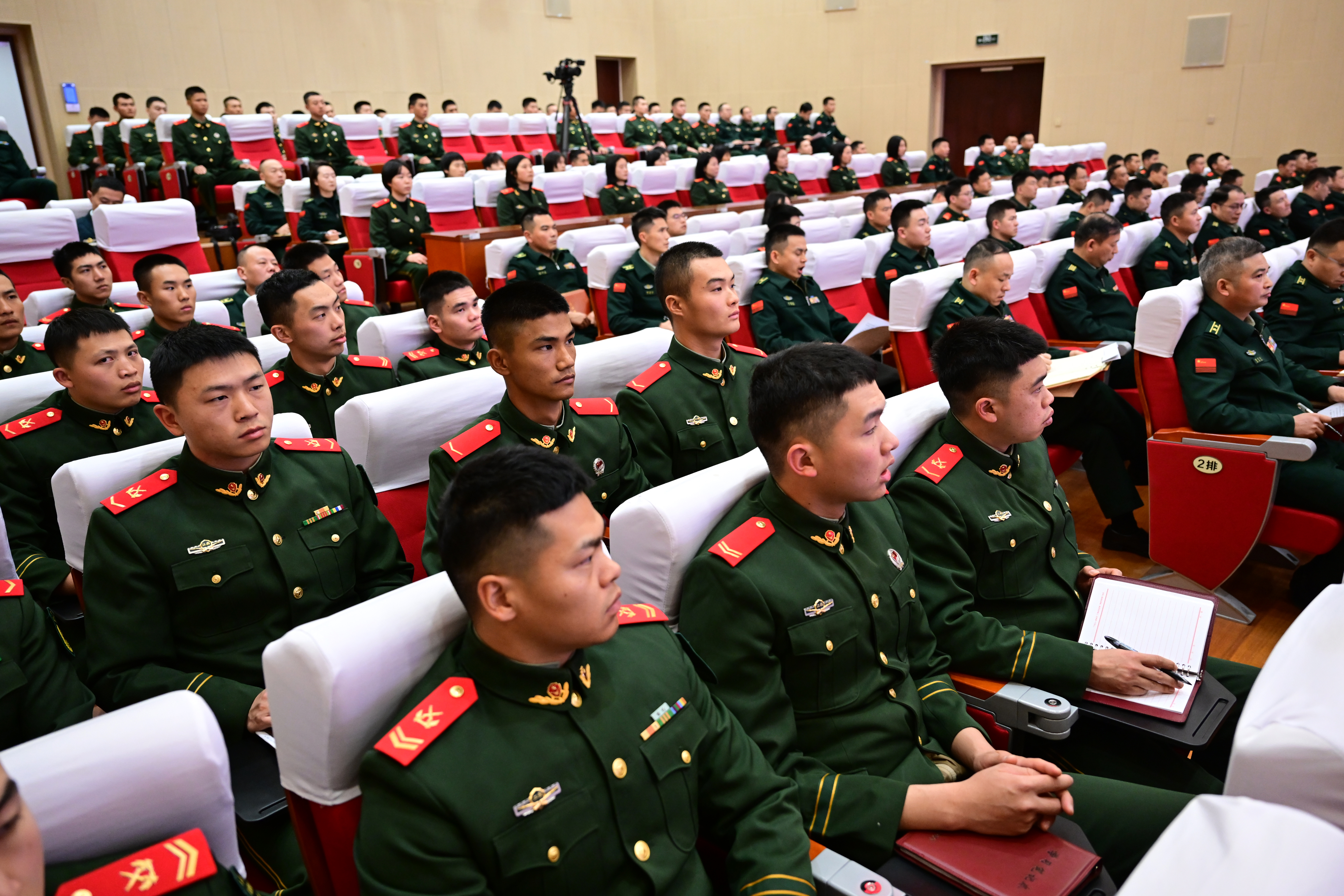 讲到《七律•长征》时,礼堂内的氛围愈发凝重。当红军将士血战湘江、四渡赤水、爬雪山、过草地等画面一一呈现,官兵感受到了一股强烈的“冲击波”。