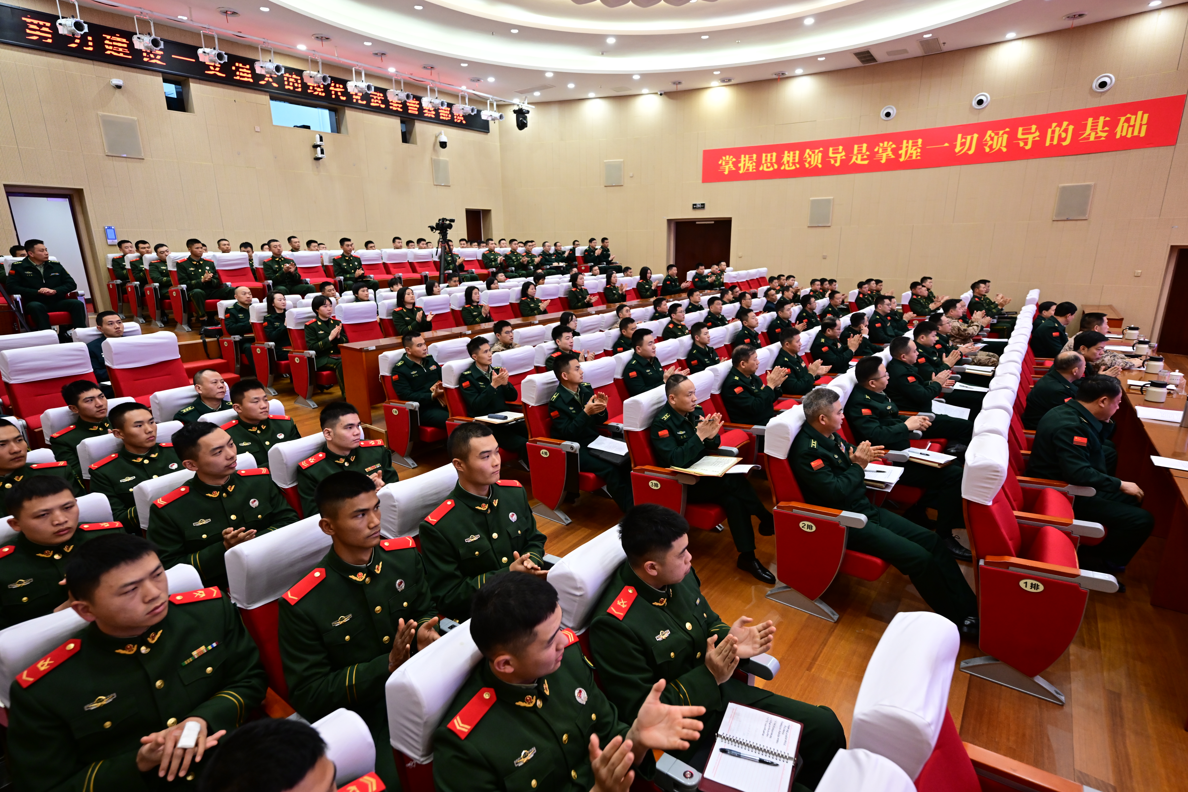 “毛主席诗词宛如一座精神宝库,生动展现出一个伟大革命领袖高瞻远瞩的政治远见、坚定不移的革命信念、勇于开拓的非凡魄力、炉火纯青的斗争艺术、杰出高超的领导才能、心系人民的赤子情怀、坦荡宽广的胸怀境界、艰苦奋斗的优良作风,这些穿越时空的精神密码,正是我们强军路上的不竭动力。”授课人抑扬顿挫地讲述,赢得场上阵阵掌声。